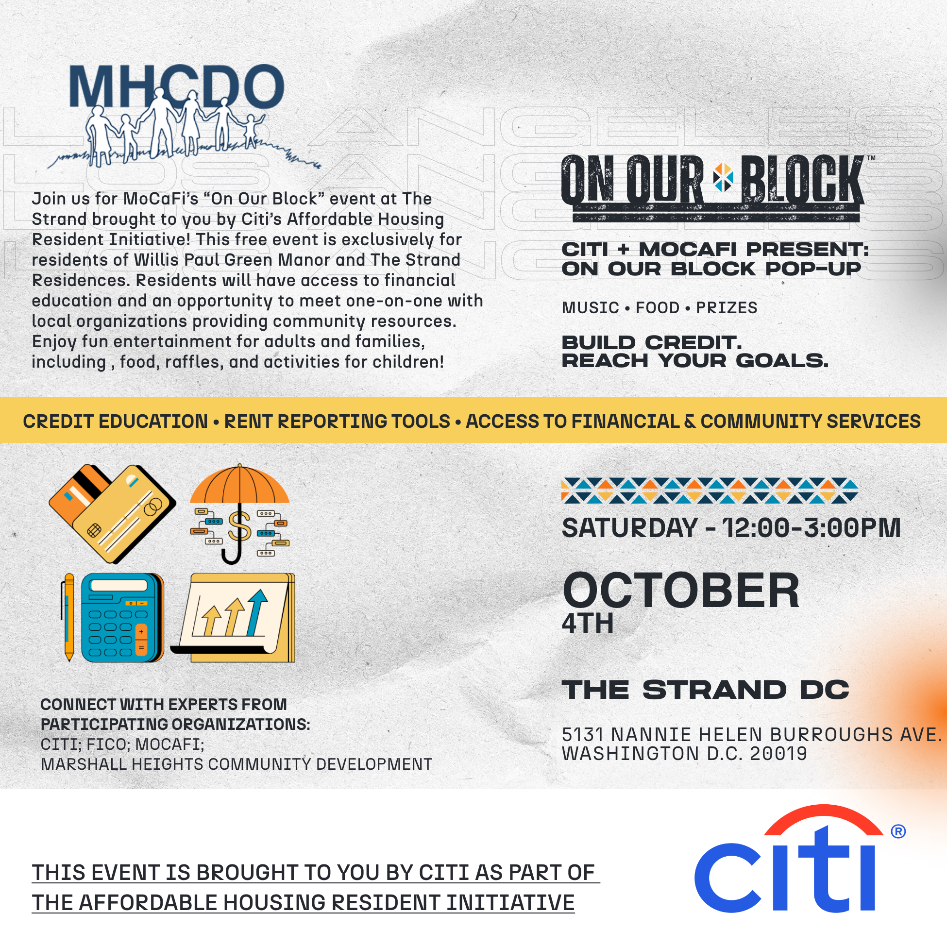 Join us for MoCaFi’s “On Our Block” event at The Strand brought to you by Citi’s Affordable Housing Resident Initiative! This free event is exclusively for residents of Willis Paul Green Manor and The Strand Residences. Residents will have access to financial education and an opportunity to meet one-on-one with local organizations providing community resources. Enjoy fun entertainment for adults and families, including, food, raffles, and activities for children!
